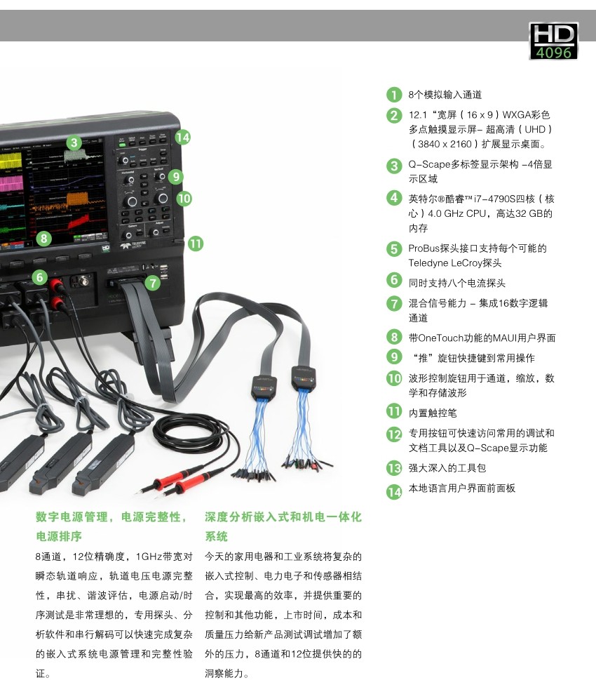 HDO8000示波器提供8個模擬輸入通道,采用力科HD4096高分辨率技術,有著高達12-bit的垂直分辨率,且帶寬高達1GHz,是用于調試三相電力電子,汽車電子和機電系統的理想工具。