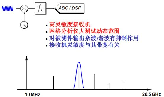 調諧接收機靈敏度度與其設置中頻濾波器帶寬有直接關系,中頻帶寬越窄,進入接收機噪聲能量越少,靈敏度相應提高,但輸出信號響應時間會變長,網絡分析儀測試速度會下降。